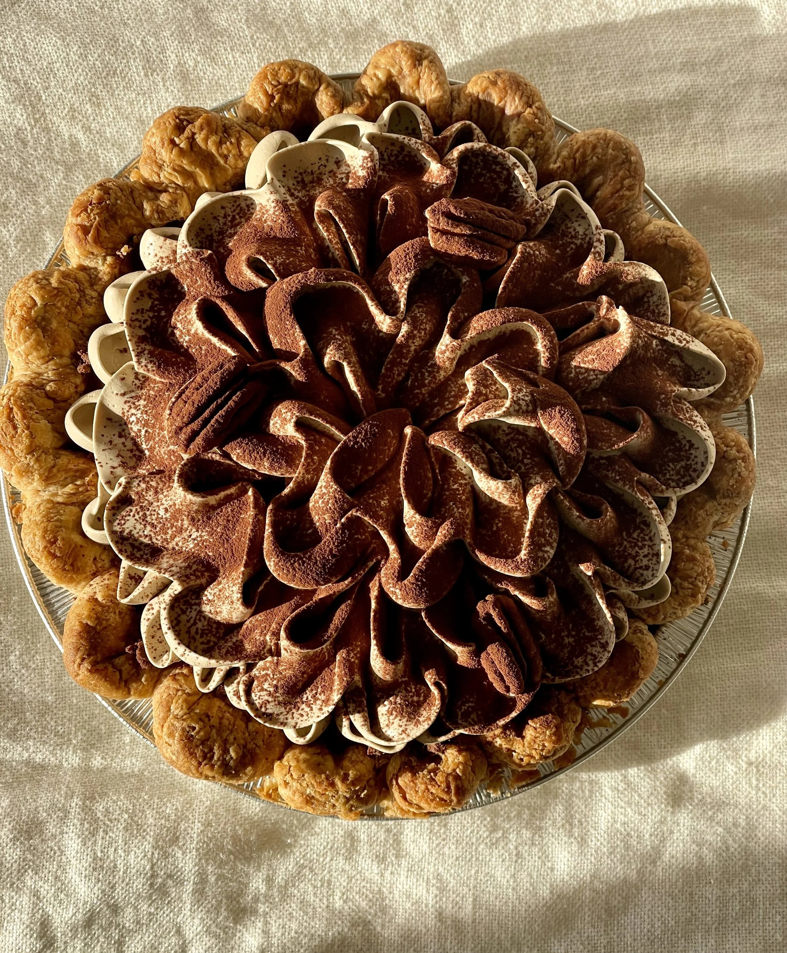 A flaky, buttery Tehachapi flour crust holds a thin layer of classic pecan pie filling, topped with a silky dark chocolate salted cream and finished with a cloud of roasted-hojicha whipped cream and a soft dusting of cocoa. Cozy, layered, not too sweet perfect holiday pie. $65