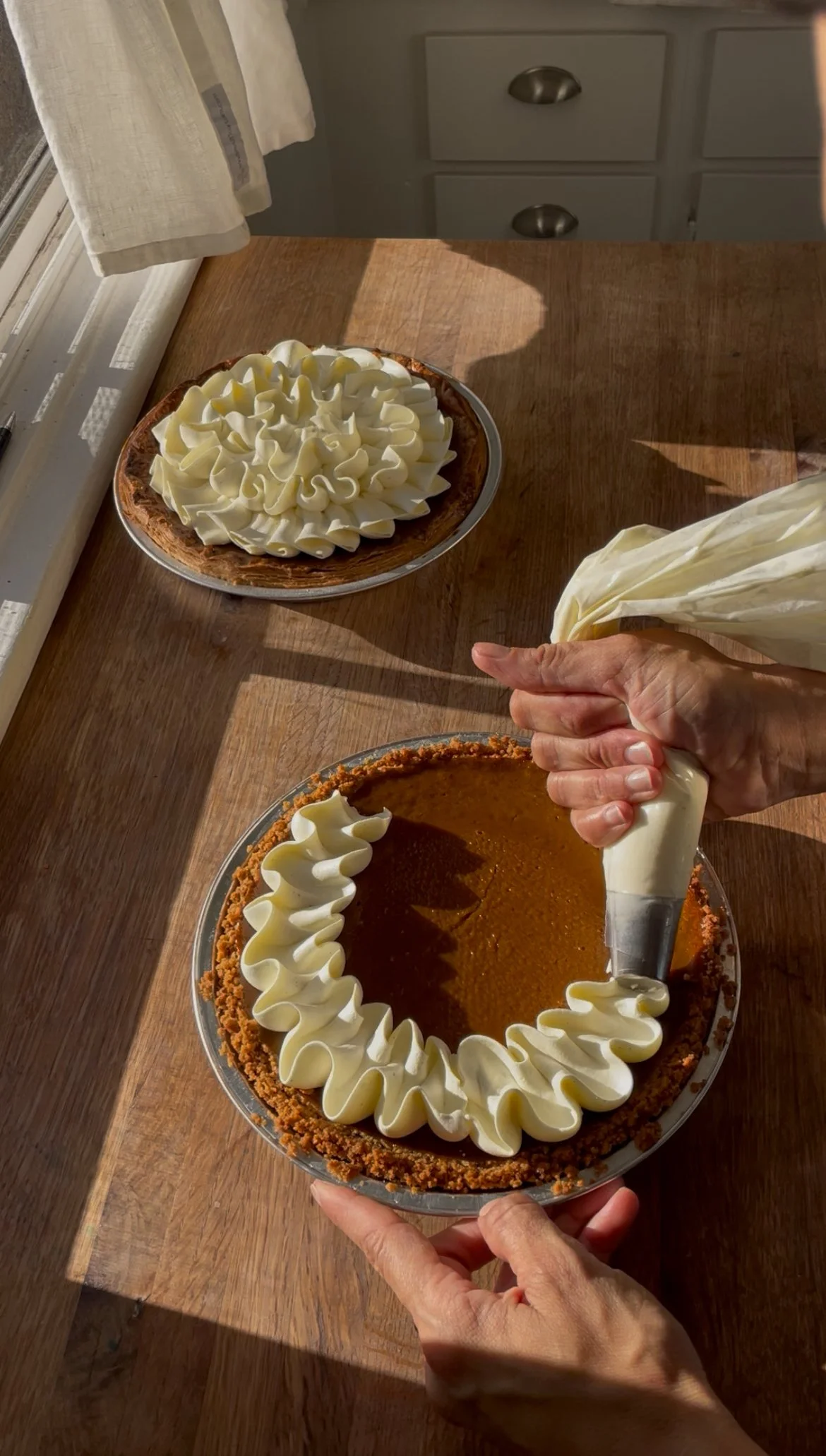 Silky, spice-forward pumpkin custard made with real pumpkin and kabocha squash, baked in a deeply aromatic brown-butter malted crust. Smooth, fragrant, and perfectly balanced — finished with a vanilla crème fraîche whip.